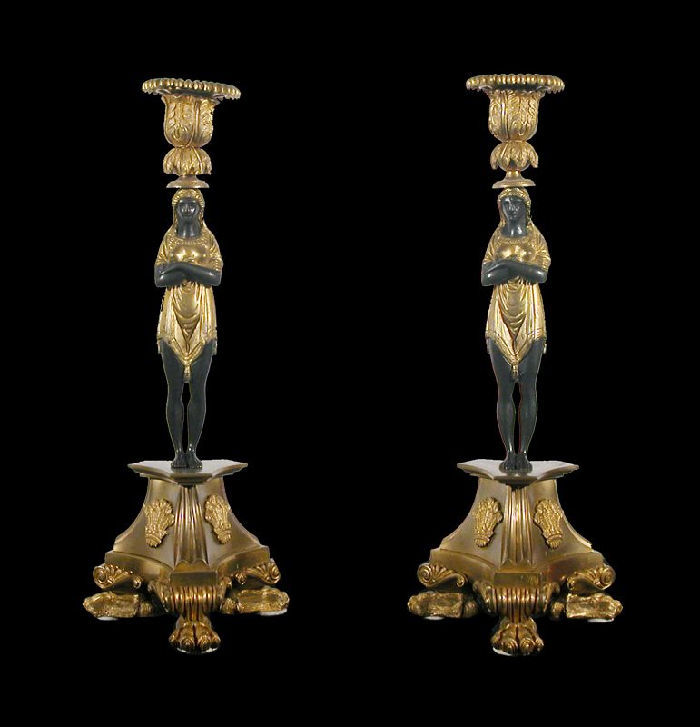 | coppia di candelieri a una fiamma in bronzo dorato e patinato con nubiane, inizi del XIX secolo, Roma | |