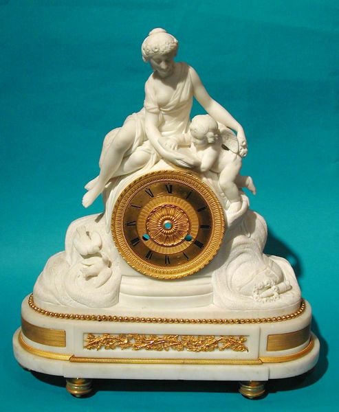 "Venere ed Amore". Misure cm: h. 50x45x18. Luigi XVI. Descrizione: Pendola: "Venere ed Amore". Misure cm: h. 50x45x18. Manifattura: Francia. Epoca e stile: fine Luigi XVI (1774-93). Materiali: bronzo cesellato e dorato, marmo statuario. Restauri: pulita e revisionata, funzionante. Venere accudisce Amore insegnandogli a leggere. Sotto a sinistra due colombe, attributi della dea, tubano. Sulla destra è posata la faretra, attributo di Cupido, ed una ghirlanda di fiori. Questo tipico tema settecentesco è qui realizzato in maniera impeccabile: sia per la perfetta composizione, che per la qualità dell'esecuzione. Molto apprezzati questi soggetti erano di norma realizzati in bronzo dorato, nel prezioso biscuit e nel tenero alabastro; molto più rari quelli eseguiti in marmo statuario. Movimento di tipo Parigi, con suoneria delle mezze e delle ore per mezzo di ruota partitora, con carica di otto giorni e sospensione del pendolo a filo. Quadrante di bronzo dorato, lancette traforate e dorate. |