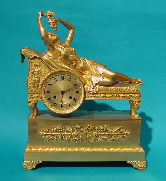 Baccante I° Impero Descrizione: Manifattura: Francia, attribuita a Thomire. Epoca e stile: I° Impero (1805-15). Materiali: bronzo cesellato e dorato. Restauri: pulita e revisionata, funzionante. Publicazioni: "Die franzoesische Bronzeur", Niehueser, pag. 56; "Vergoldete Bronzen", Ottomeyer, Proeschel, vol. I, pag. 379.Di questa pendola si conoscono differenti versioni: sia con la baccante vestita, che con la stessa nuda. Apprezziamo la qualità del cesello del triclinio e la resa anatomica della figura. Movimento di tipo Parigi, con suoneria delle mezze e delle ore per mezzo di ruota partitora, con carica di otto giorni e sospensione del pendolo a filo. Quadrante in bronzo dorato, lancette tipo Breguet. |