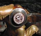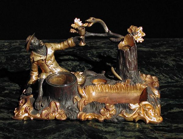 Calamaio con monogramma di Francesco Giuseppe. Descrizione: Soggetto. la virtù uccide il vizio. Manifattura: Austria. Materiali: bronzo cesellato patinato e dorato, argento, smalto. Il monogramma è sul cappello della scimmietta e riporta oltre alle iniziali F.J. il motto della marina imperiale austriaca "Viribus Unitis". La qualità è sempre alta quando l'oggetto è prodotto per un'importante commissione: fusioni frazionate, materiali preziosi, cura del cesello. Per confronti vedi identico monogramma su di una spada al museo di Trieste. |