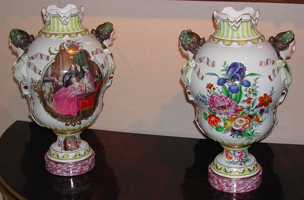 Vasi "Agustus Rex". Misure cm: h. 46x30x27. Manifattura: Meissen. Marca in blu sottovernice A R intrecciate in monogramma. Epoca e stile: primo terzo del Settecento. Materiali: porcellana policroma. Questa marca è stata usata nelle prime fasi della manifattura e fa riferimento ad Augusto II il Forte re di Polonia e grande elettore di Sassonia con il nome di Federico Augusto I. Con tale marca è anche identificato il vaso tipo, ispirato alle forme della porcellana cinese. I manici sono raffigurati come testine femminili. Su di una faccia trionfo di fiori, sull'altra riserva con scena galante. Base marmorizzata. |